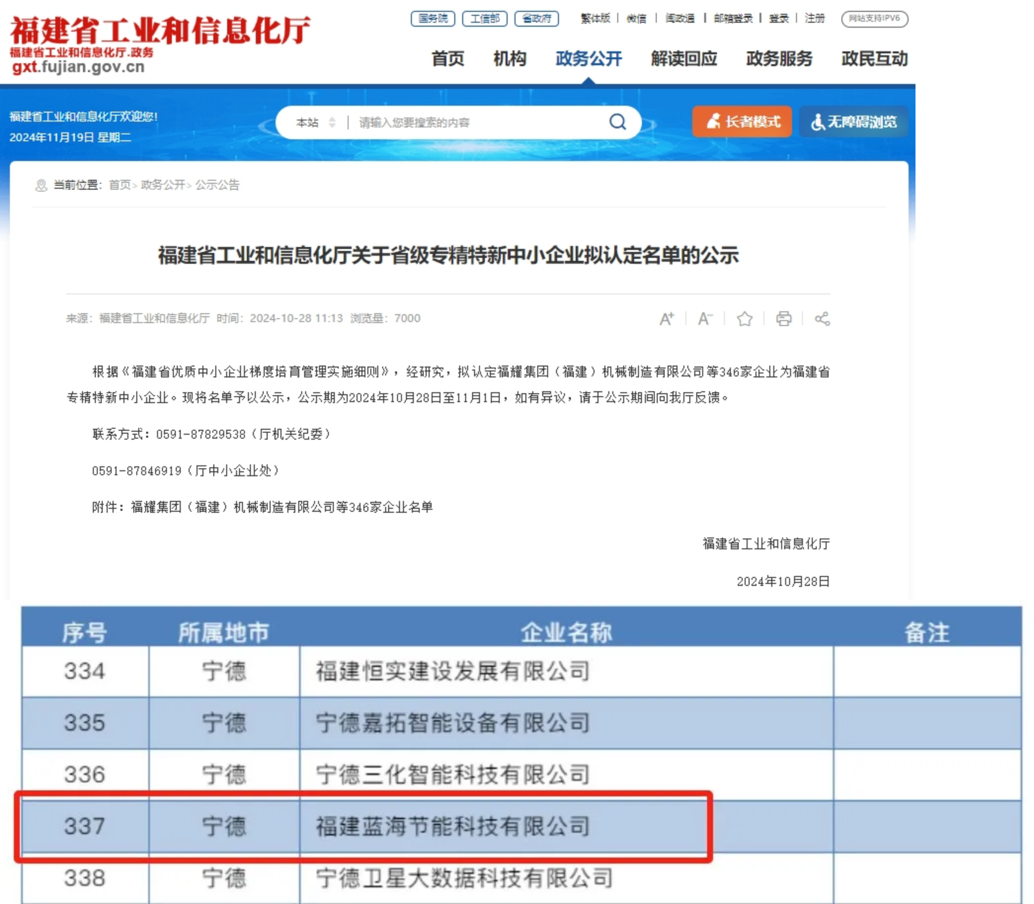 2024年10月,福建省工业和信息化厅发布文件《关于公布福耀集团(福建)机械制造有限公司等349家省专精特新中小企业名单的通知》文件中,我司福建蓝海节能科技有限公司名列其中。